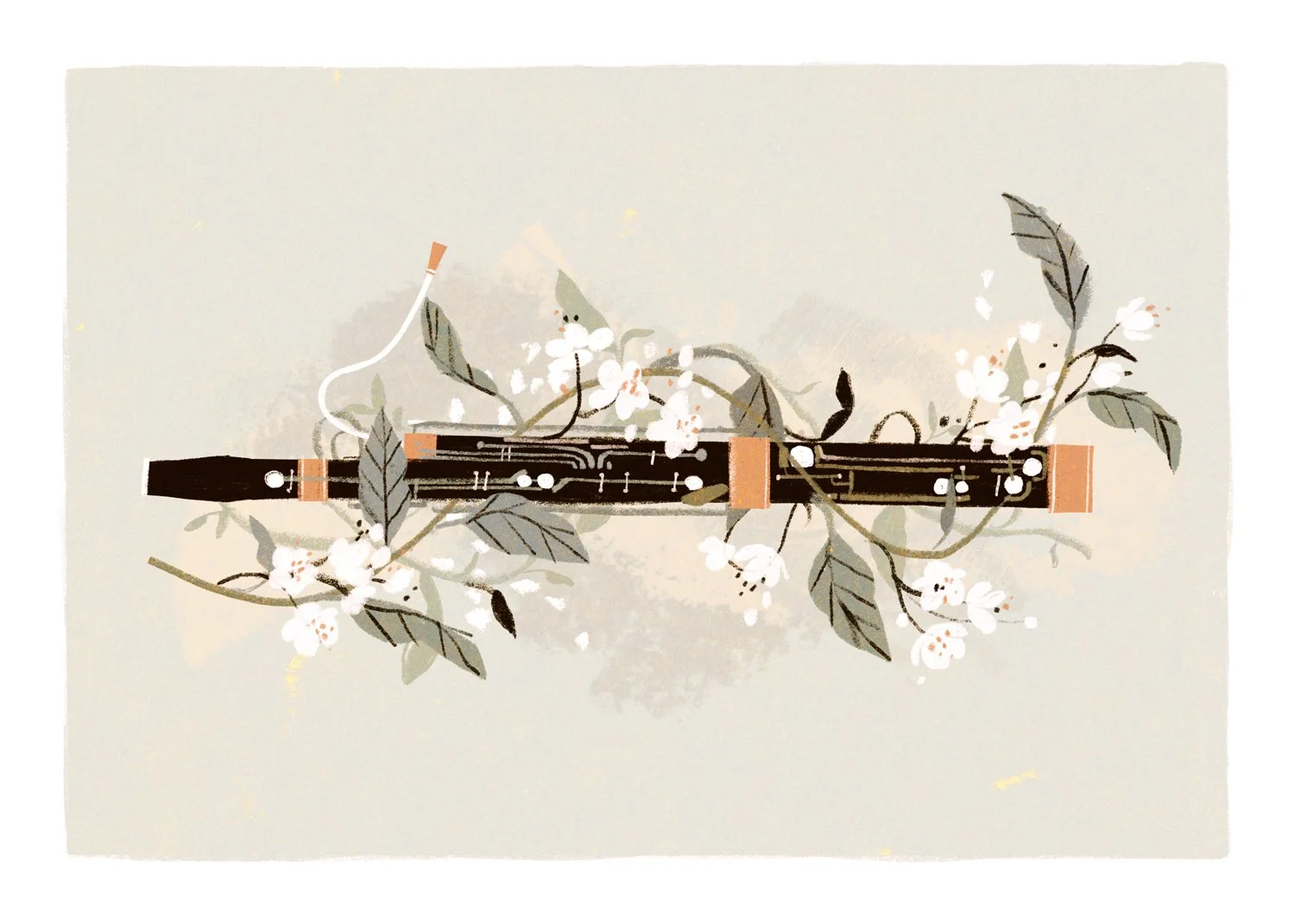 A promotional series for a spring concert with Apogee Orchestra, including an illustrated poster, and three postcards featuring a Bassoon, Cornet, and Viola.